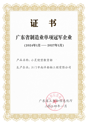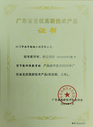 ![]() 2024年1月 JNS 40500DWT敞開口型節(jié)能環(huán)保散貨船被認定為2023年高新技術產品。 ![]() 2024年1月 被認定為廣東省制造業(yè)單項冠軍企業(yè)。 ![]() 2024年11月 JNS第五次被認定國家高新技術企業(yè) ![]() 2024年12月 榮獲“廣東省制造業(yè)企業(yè)500強"第148位。 |