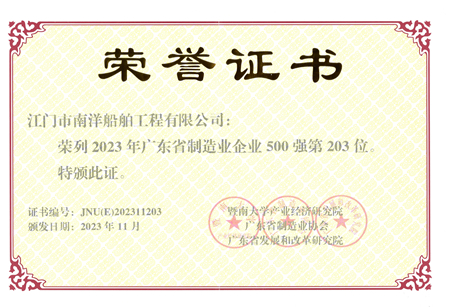 ![]() 2023年12月 榮獲“廣東省制造業(yè)企業(yè)500強"第203位。 |