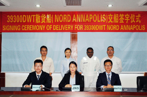 20181025日,JNS157Nord Annapolis號交接簽字。正午十一時許,隨著碼頭陣陣鞭炮聲響起,Nord Annapolis號緩緩離開公司碼頭,啟程遠航。